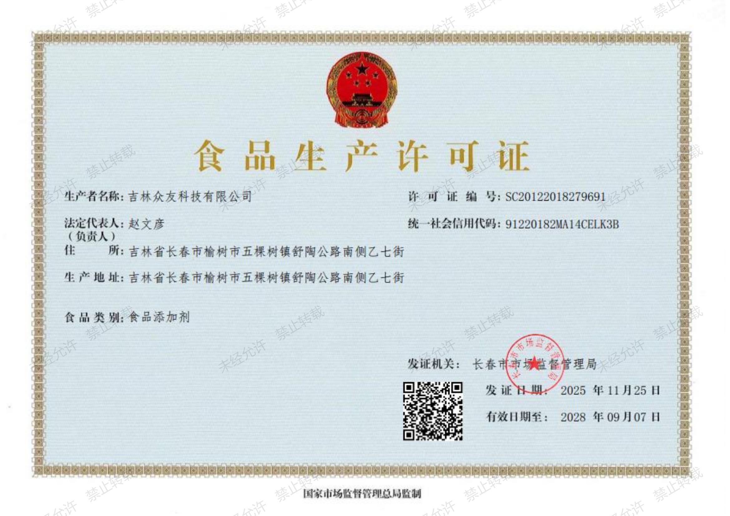 10 月 27 日,吉林众友申报“增项辛烯基琥珀酸淀粉钠”生产许可资质。依托深耕淀粉衍生物领域的技术积淀加上企业高效完成线上申报、线下递件及材料补充等全流程准备,经资料核验与现场问询,审核顺利通过。11 月 25 日,吉林众友成功获得含该新增项目的《食品生产许可证》。此次资质落地,不仅标志着吉林众友在食品领域的管理体系更加完善,更彰显其在工艺技术、生产管理上的硬实力,为提升在食品市场竞争力、拓宽业务版图迈出关键一步。