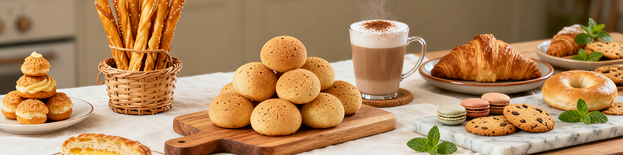 麻薯面包卡拉棒泡芙、蛋糕、瑞士卷、裹衣花生、西点类等。