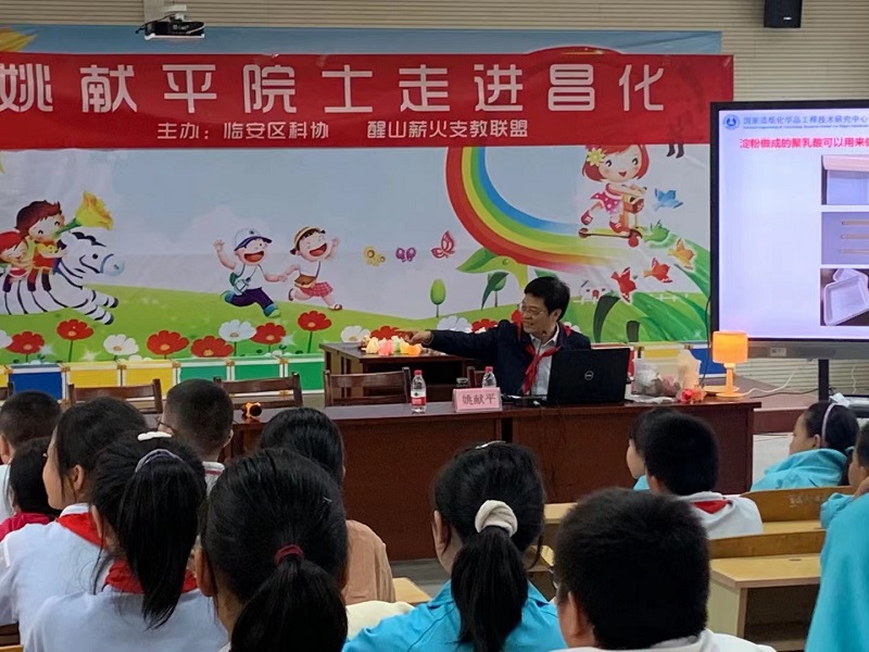 10月12日下午,联合国科学院院士、俄罗斯自然科学院院士、中国化工学会会士、生物质材料专家、杭州市化工研究院院长、国家造纸化学品工程技术研究中心主任姚献平来到湍口小学,给四至六年级的孩子上了一堂生动有趣的科普课。“塑料需要多少年才能降解?生物质材料有哪些?”姚院士围绕《神奇的生物质功能材料》一边向大家讲解知识,一边提出了问题。他不但向同学们介绍了3D打印的相关知识,而且阐述了打开科学大门的三把钥匙:好奇心、责任心和事业心。最后还分享了自身感悟,勉励同学们珍惜现在的大好时光,认真努力学习,将来从事科学研究事业,为国家作出更大贡献。本次科普活动在同学们心中播下了科学的种子,开启了他们探索科学天地的兴趣,让更多的孩子爱上了科学。