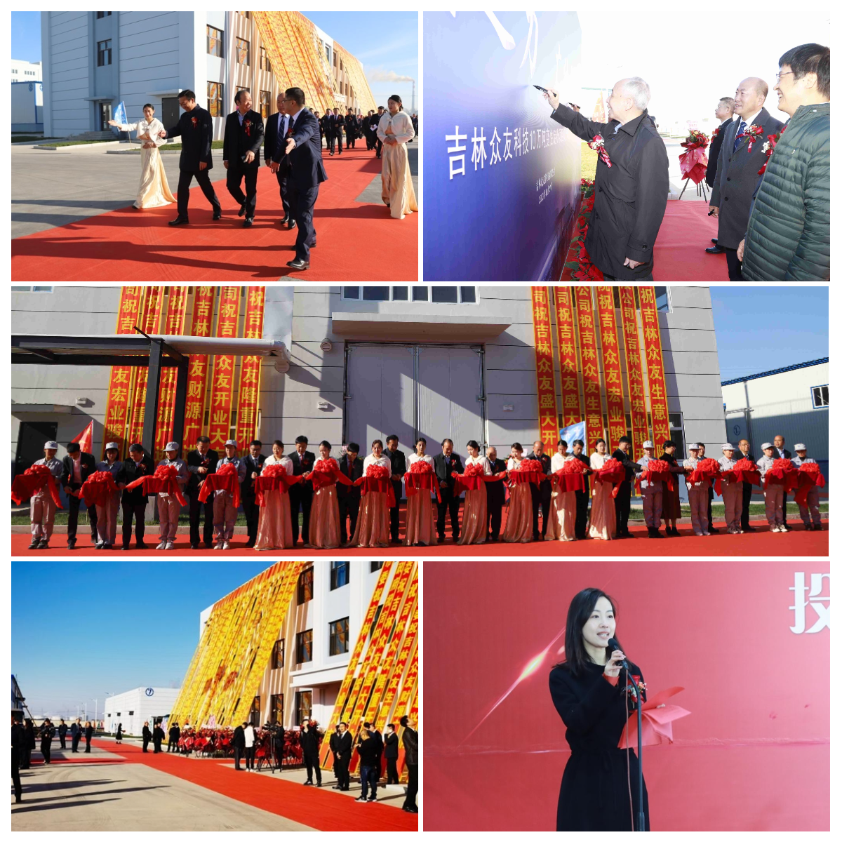 随后中国工程院院士舒兴田、杭化院姚献平院长、合作伙伴代表斯泰格总经理张鸿硕分别致祝贺辞。榆树市委书记林小明在投产仪式中充分肯定了众友管理团队在项目建设过程中付出的努力,并表示榆树市委市政府必定会用最优质的服务、最优良的环境为企业发展保驾护航。佐力控股集团名誉董事长俞有强致答谢辞。会后,市委市政府相关领导、公司领导代表、合作伙伴代表参加了剪彩仪式。最后,现场嘉宾在众友工作人员的陪同下参观了新工厂。嘉宾们愉快合影,共同留下这难忘的一刻!忆往昔,峥嵘岁月,千帆过尽;看今朝,风流尽数,鱼跃龙腾;今天,众友新工厂开业盛典取得圆满成功;明天,众友将奔向新的征程!