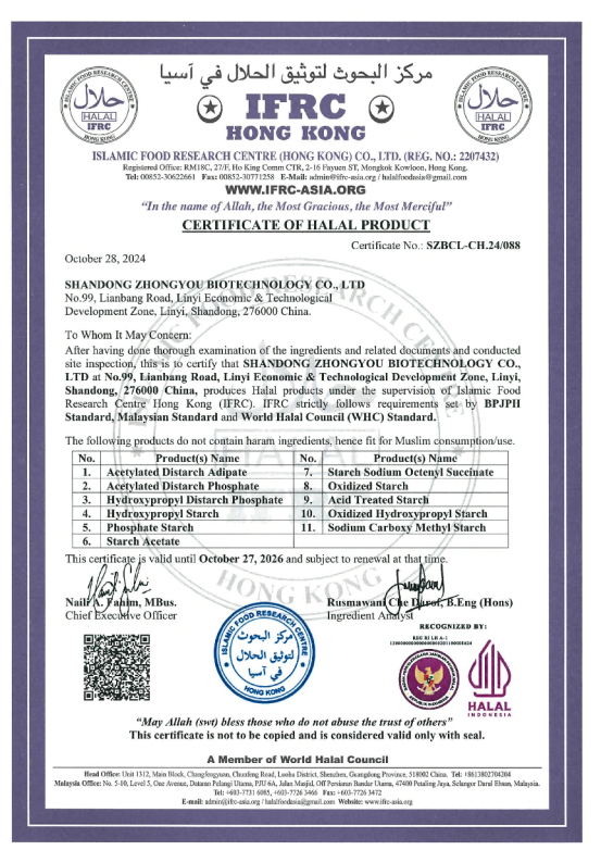 作为专业的变性淀粉生产企业,山东众友生物科技有限公司始终将品质与信赖视为根基。2024年,我们首获清真认证,迈出国际化合规经营的关键一步。今年3月,伴随食品生产许可证的更新,我们的清真认证体系也实现重要升级—认证项目从6项全面扩展至11项。